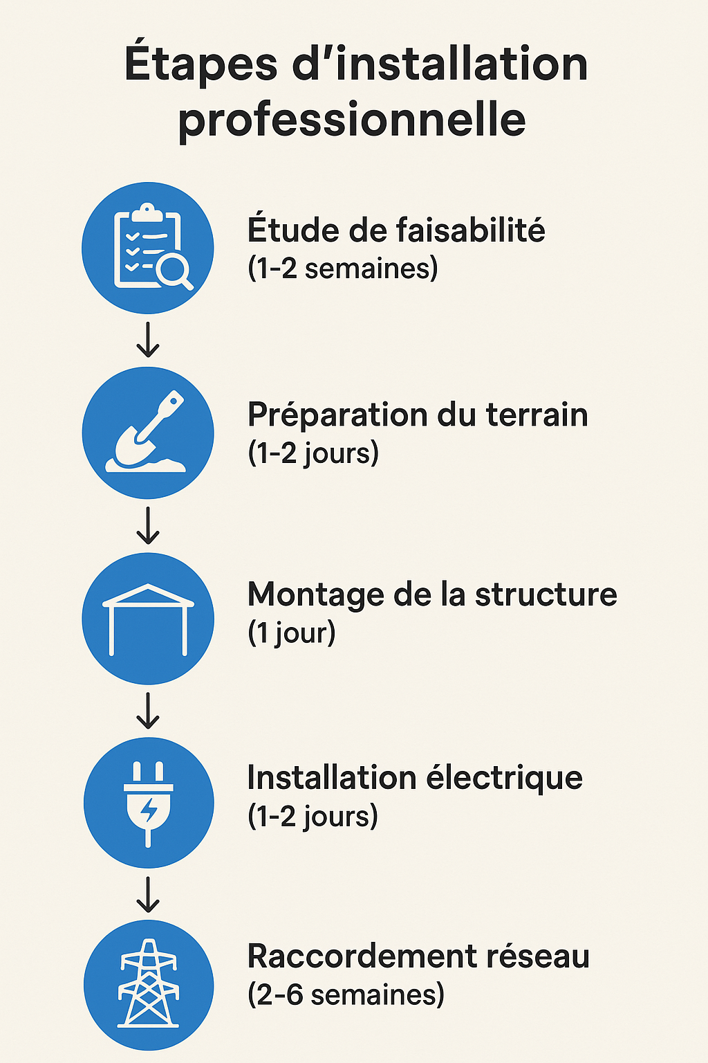 L’installation d’un carport solaire suit un processus rigoureux en cinq étapes principales.